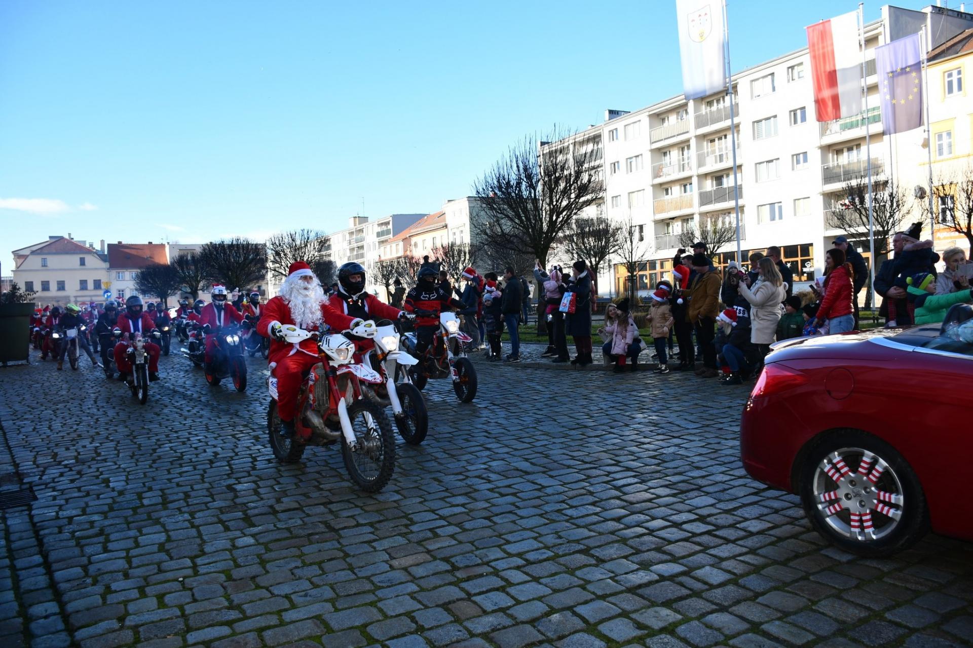 Było tłoczno, wesoło, kolorowo i bardzo głośno. Pogoda dopisała, a Moto Mikołaje nie zawiedli – ich udekorowane motocykle, auta, quady i inne pojazdy oraz pozytywna energia sprawiły, że Rynek zamienił się w jedno wielkie świąteczne święto. Dzieci machały, przybijały piątki, odbierały paczki, a rodzice robili pamiątkowe zdjęcia, próbując zatrzymać te chwile na dłużej.