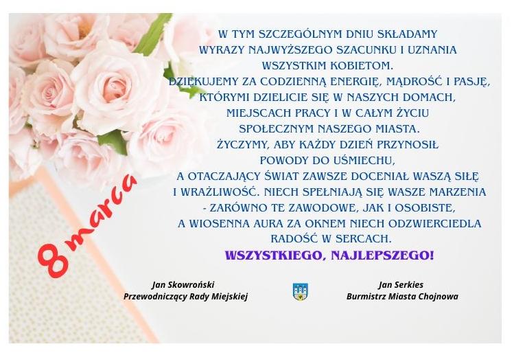W tym szczególnym dniu składamy wyrazy najwyższego szacunku i uznania wszystkim kobietom. Dziękujemy za codzienną energię, mądrość i pasję, którymi dzielicie się w naszych domach, miejscach pracy i w całym życiu społecznym naszego miasta.