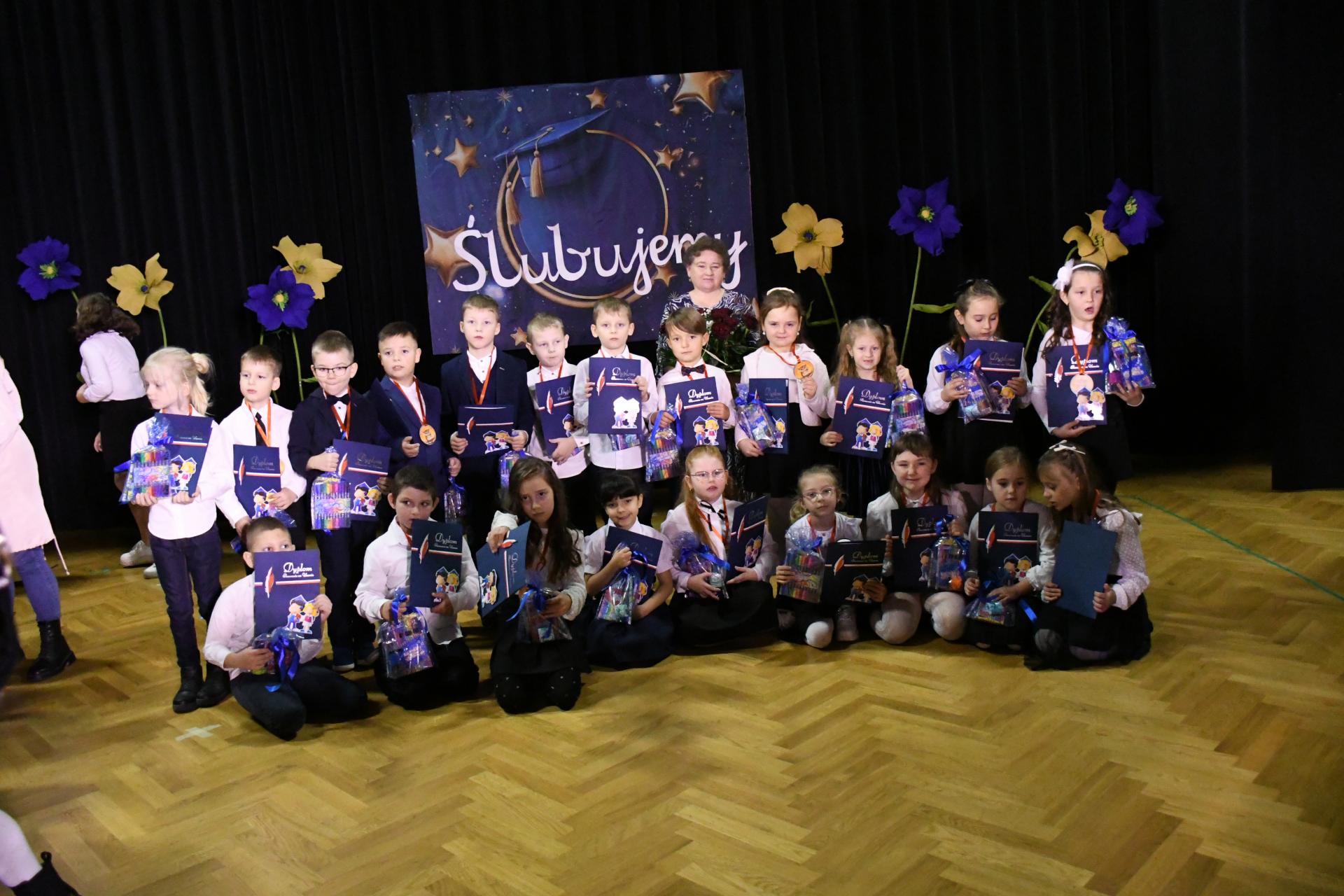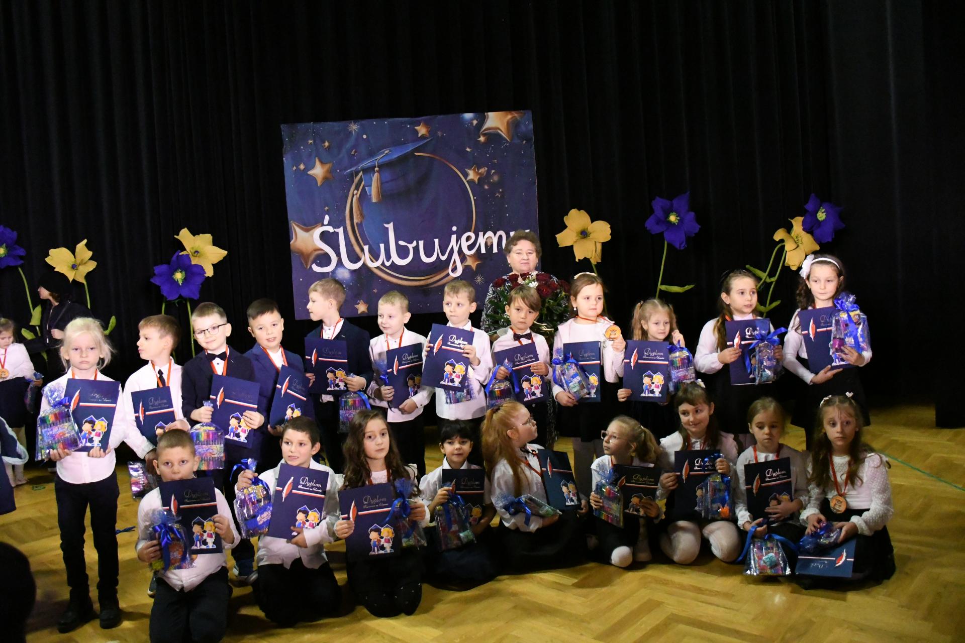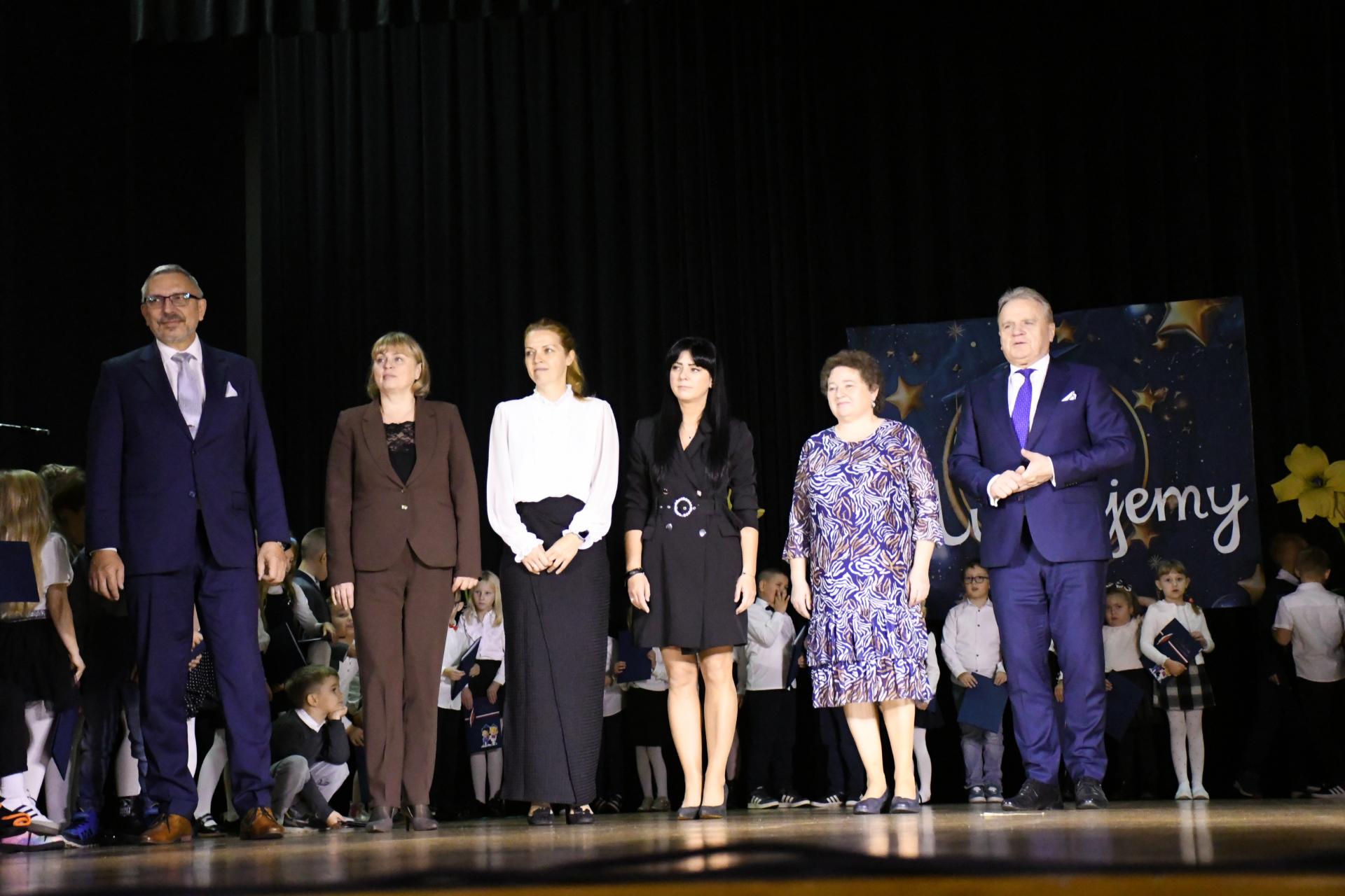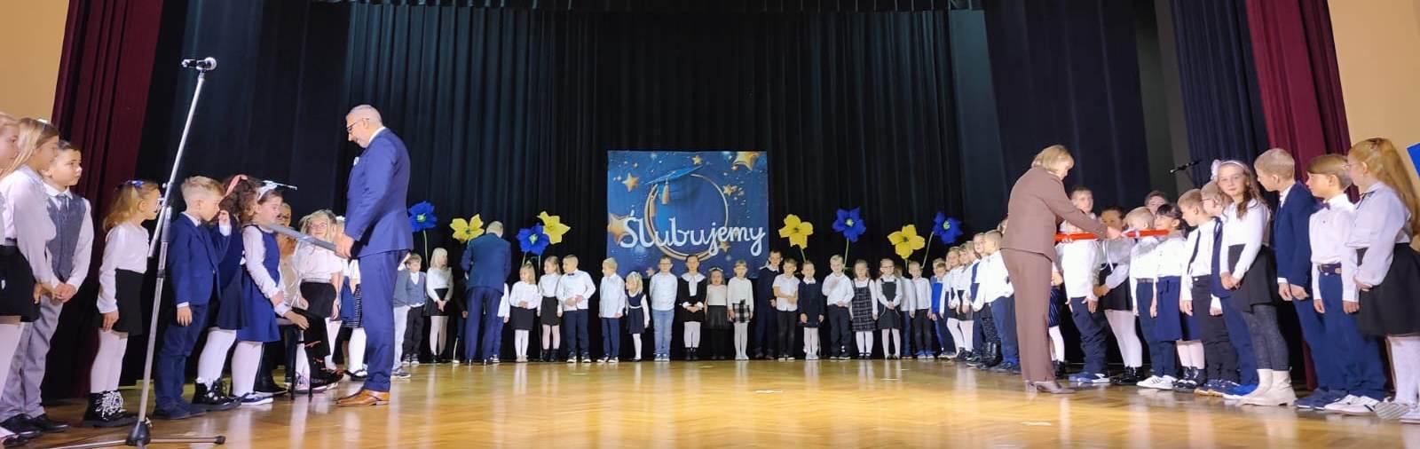 Wśród gości nie zabrakło rodziców, dziadków, rodzeństwa oraz przyjaciół szkoły. Sala wypełniła się emocjami, uśmiechami i dumą — w końcu to pierwszy tak ważny krok w edukacyjnej drodze najmłodszych uczniów. Dyrektor szkoły Mariusz Szklarz podkreślił, że to wyjątkowy moment w życiu każdego dziecka rozpoczynającego swoją szkolną przygodę. Cytując Janusza Korczaka, przypomniał: „Dzieci rodzą się ze skrzydłami. Nauczyciele pomagają im je rozwinąć” — i dodał, że w tym procesie równie ważną rolę odgrywają rodzice, dziadkowie i wszyscy, którzy wspierają dziecko w jego rozwoju. – To proces delikatny, długotrwały i bardzo odpowiedzialny. Dzisiejsze dzieci to pokolenie Alfa – inteligentne, ciekawe świata, dla którego technologia jest czymś naturalnym. Ale w tym wszystkim najważniejszy jest człowiek. Musimy nauczyć nasze dzieci dobra, miłości i szacunku – mówił dyrektor.