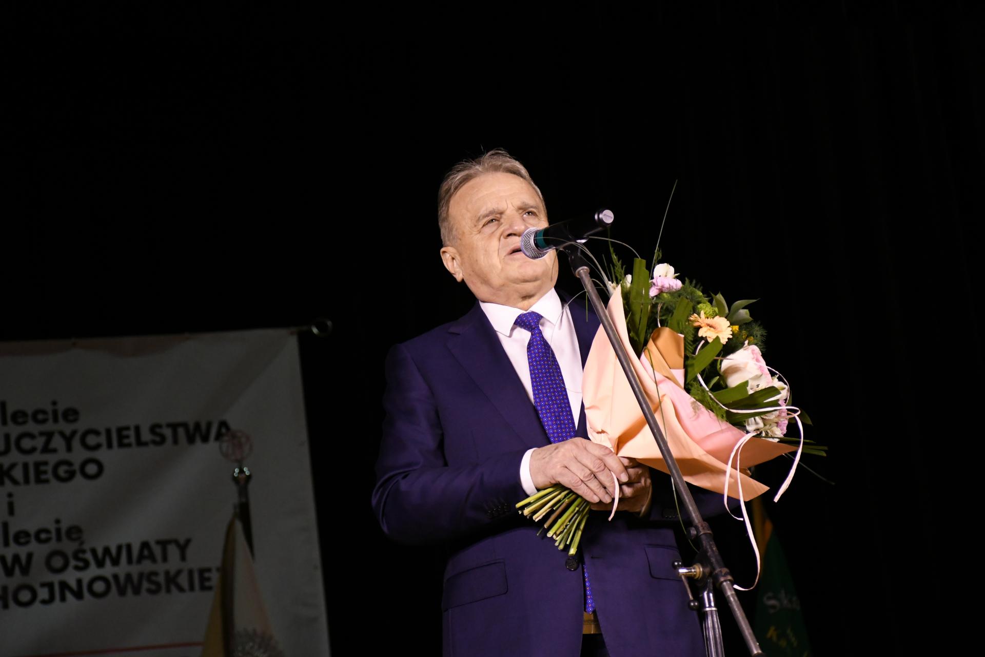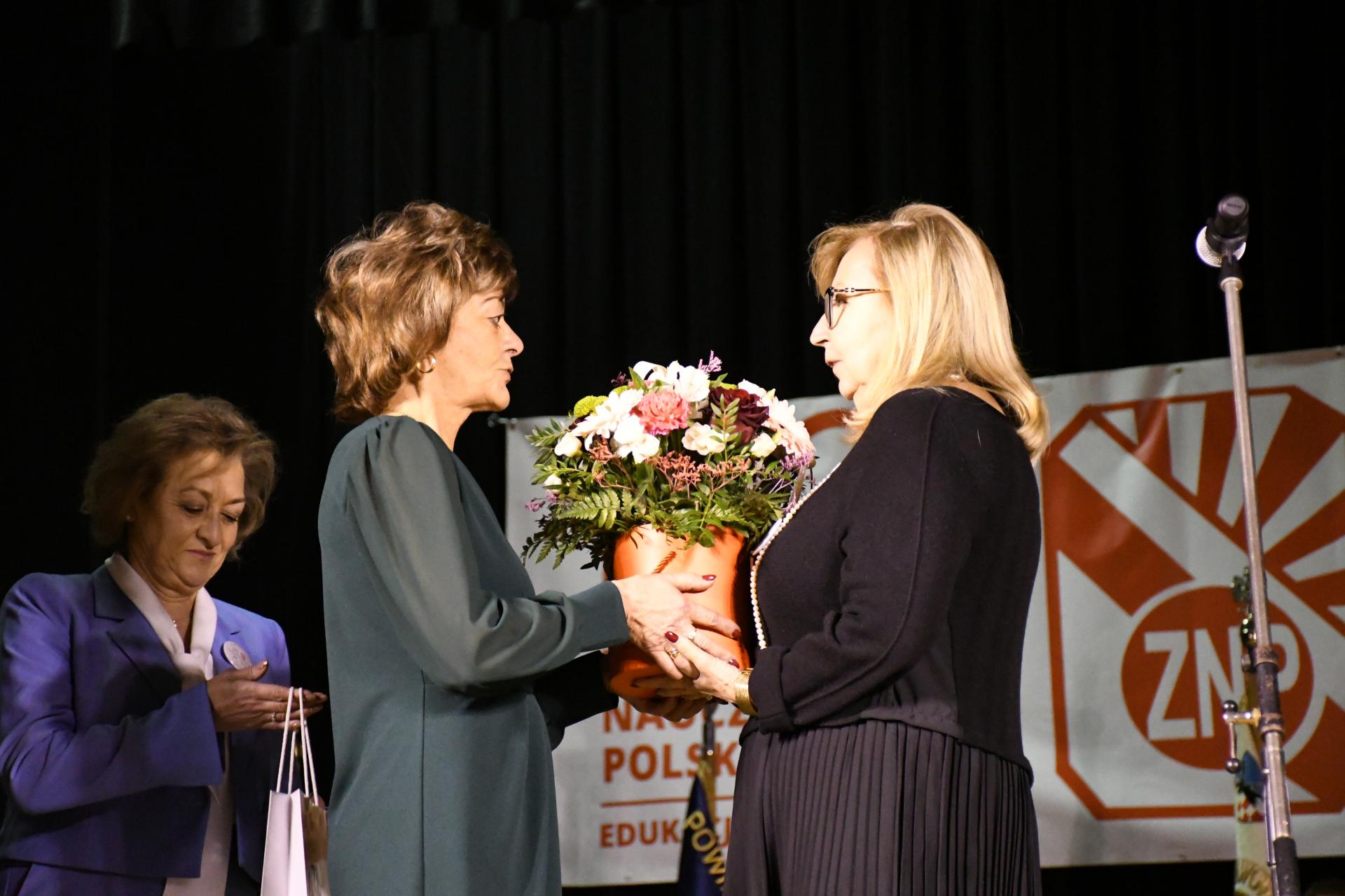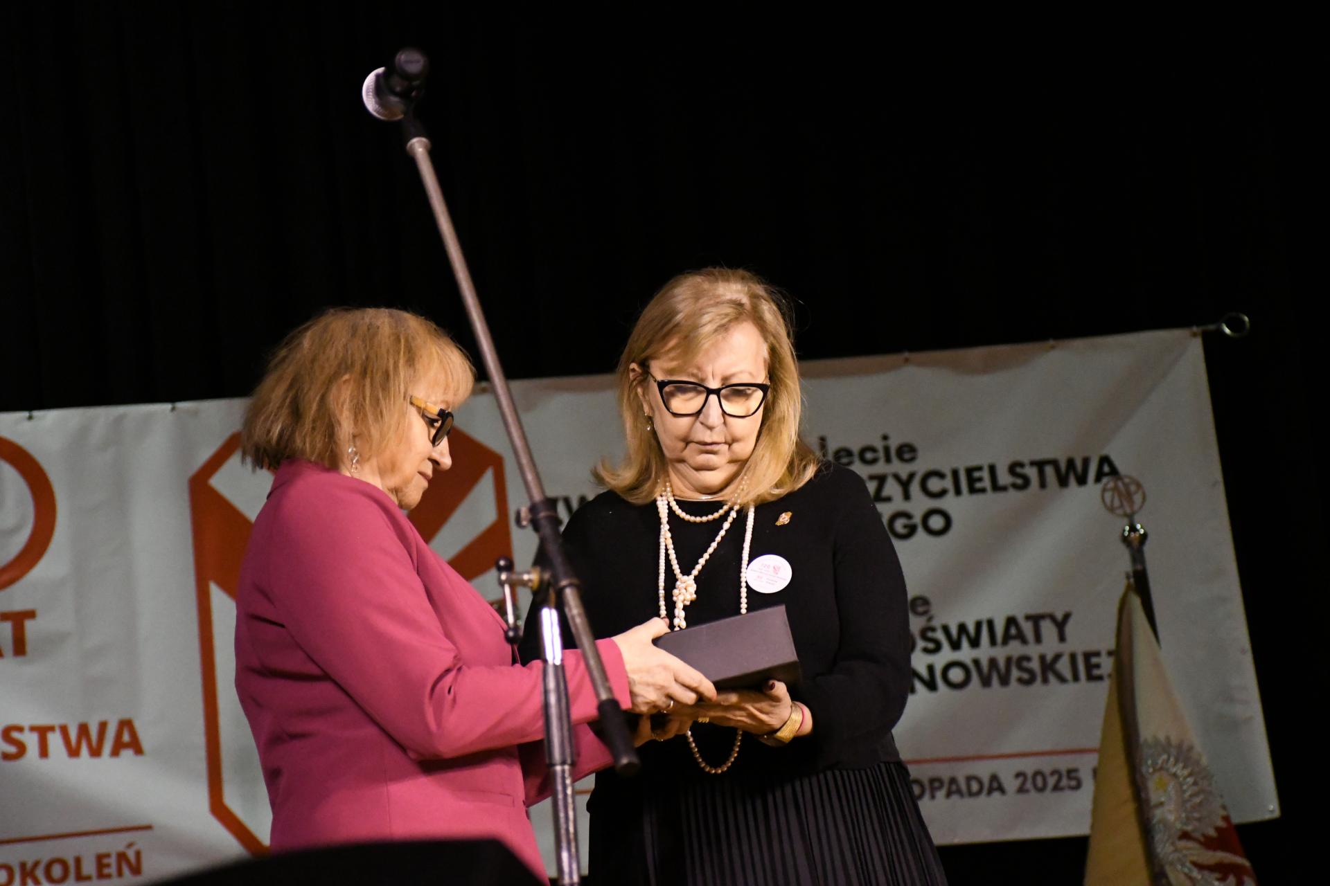 Jednym z najważniejszych momentów wydarzenia było wręczenie statuetek, legitymacji oraz złotych odznak ZNP, przyznanych za działalność, zaangażowanie i wieloletnią pracę na rzecz środowiska oświatowego. Padło wiele ciepłych słów, gratulacji i podziękowań – zarówno oficjalnych, jak i tych płynących z głębi serca. Wspominano ludzi, którzy przez dekady tworzyli chojnowską oświatę. Wicestarosta Janina Mazur przypomniała o znaczeniu pierwszych powojennych osadników i o początkach szkolnictwa w mieście:– Od ponad dziesięciu lat realizujemy program upamiętniający pionierów. W Chojnowie pierwsza działalność edukacyjna narodziła się w Szkole Podstawowej nr 1. Pionierem był Antoni Leśniowolski – to na dorobku takich osób budujemy współczesną szkołę – mówiła.