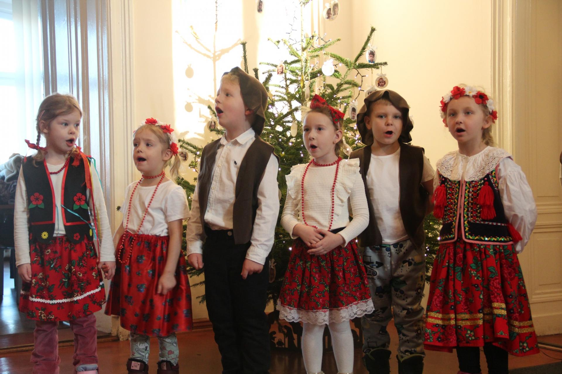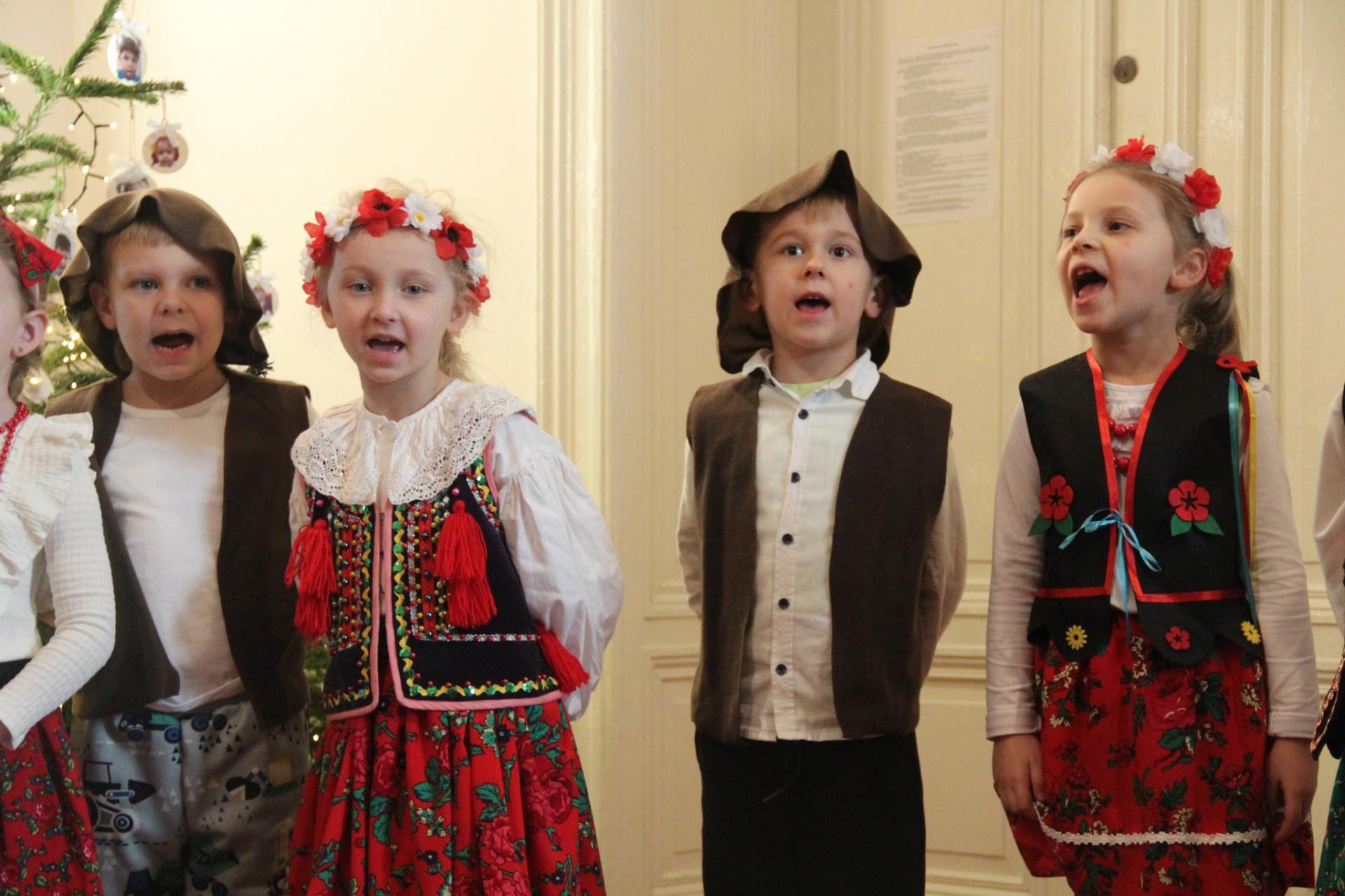 Dzieci prezentowały się zjawiskowo! Ubrane w piękne, świąteczne stroje, zaśpiewały z ogromnym zaangażowaniem tradycyjne kolędy. Ich występ, pełen dziecięcej radości i czystego dźwięku, rozgrzał serca wszystkich słuchaczy i wprowadził do ratusza magię zbliżających się Świąt Bożego Narodzenia.